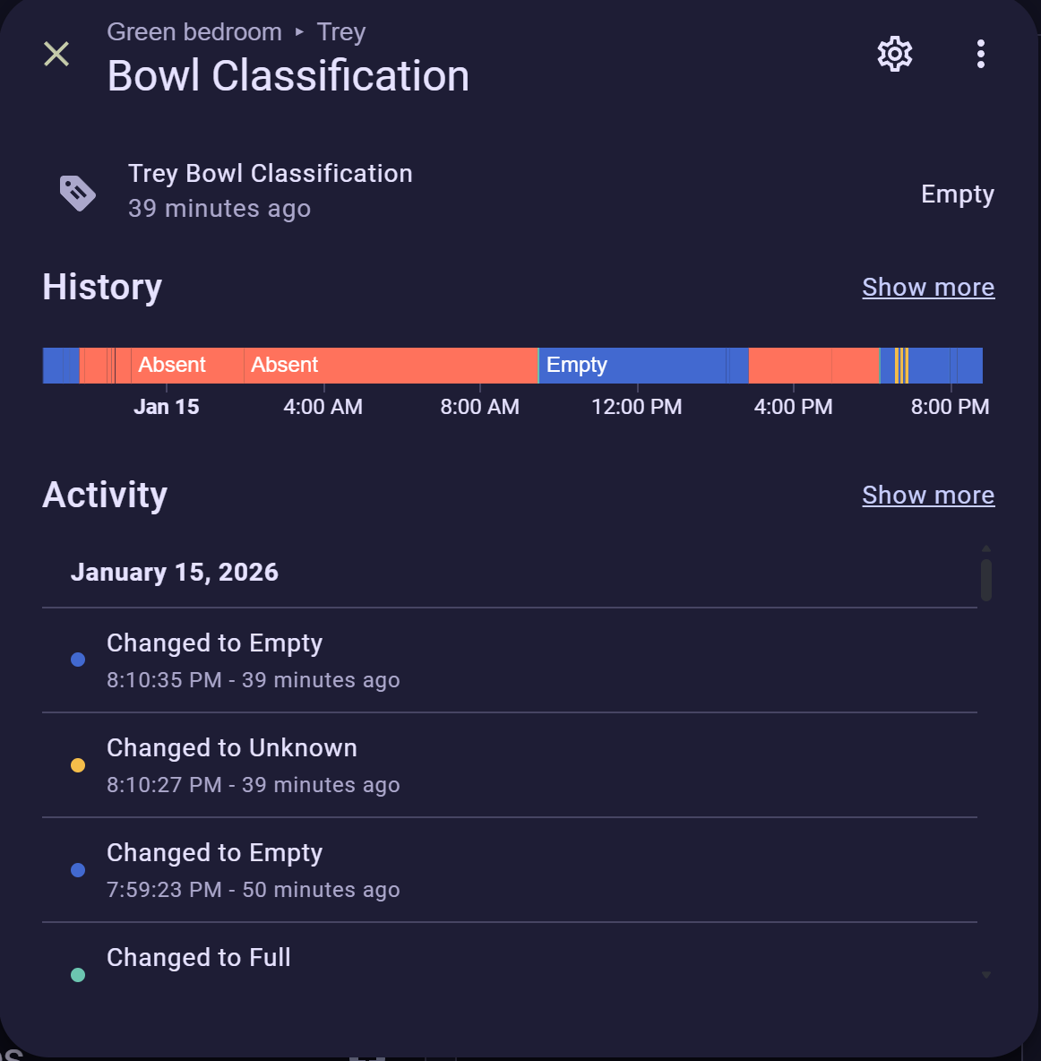 After just a few days of adding diverse images, the model is now doing an excellent job detecting Trey's bowl states. In Home Assistant, I now have a clean sensor that I can use for notifications and tracking.