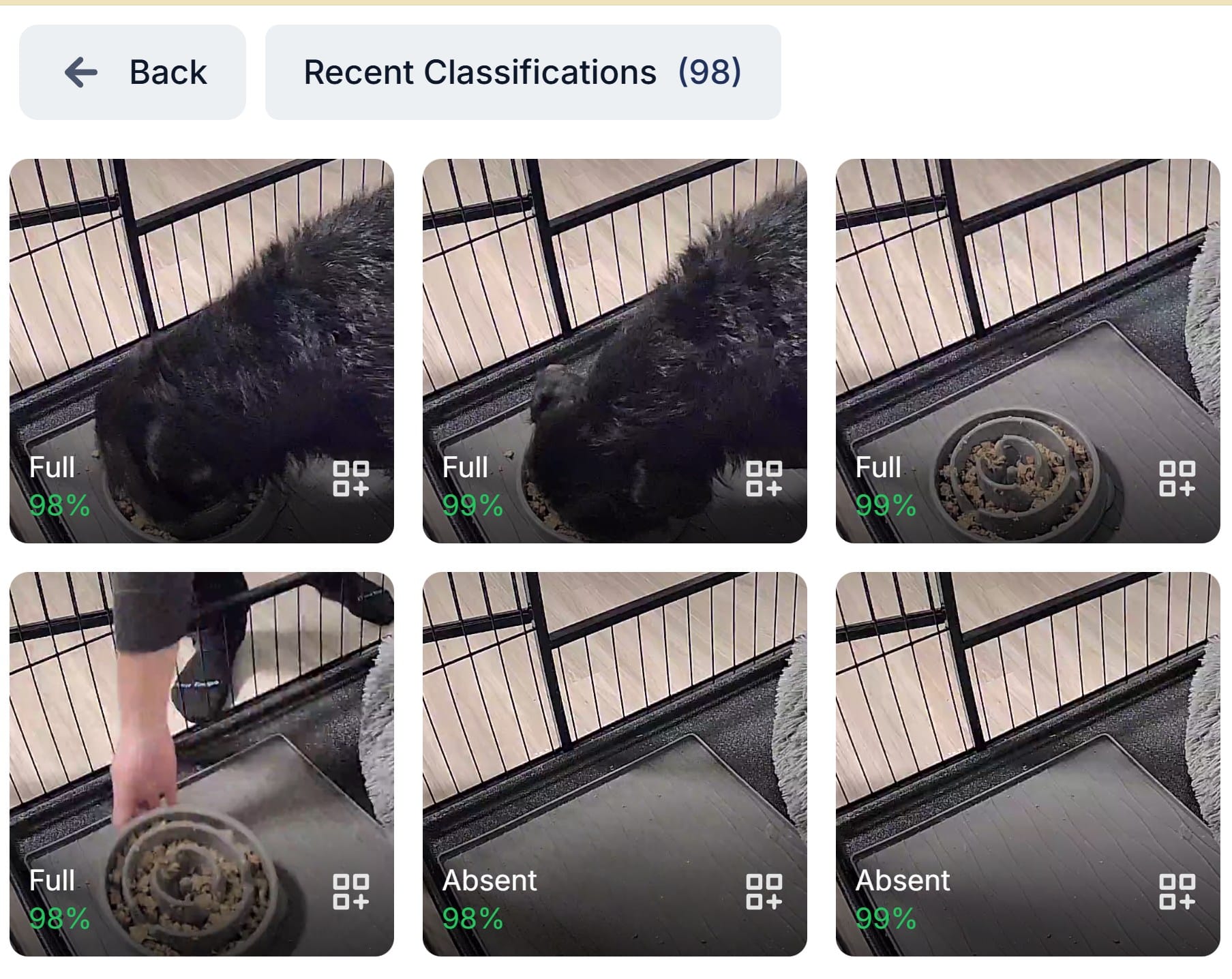 Frigate will subsample existing recordings. You then go through and label these images. For example, I marked images where Trey was still eating as “Full.” Consistency is key here—decide on your “line” for each state and stick to it. Don't worry if a certain state has no images. You'll be able to add them later. Once you have a starting set, press Train.